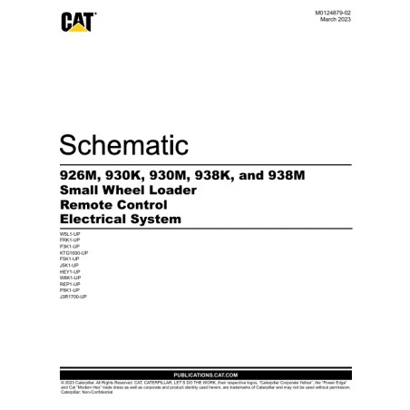 Manual técnico PDF (M0124879-01) do Sistema Elétrico de Controle Remoto para Carregadeiras Pequenas CAT 926M, 930K, 930M, 938K e 938M. Produto 100% digital com envio automático por download.