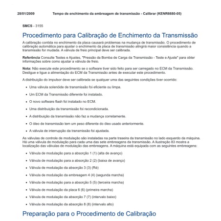 Procedimento técnico PDF (KENR6680-05) para realizar a Calibração de Enchimento das Embreagens da Transmissão Caterpillar. Essencial para corrigir trancos e falhas nas trocas de marcha. Produto 100% digital.